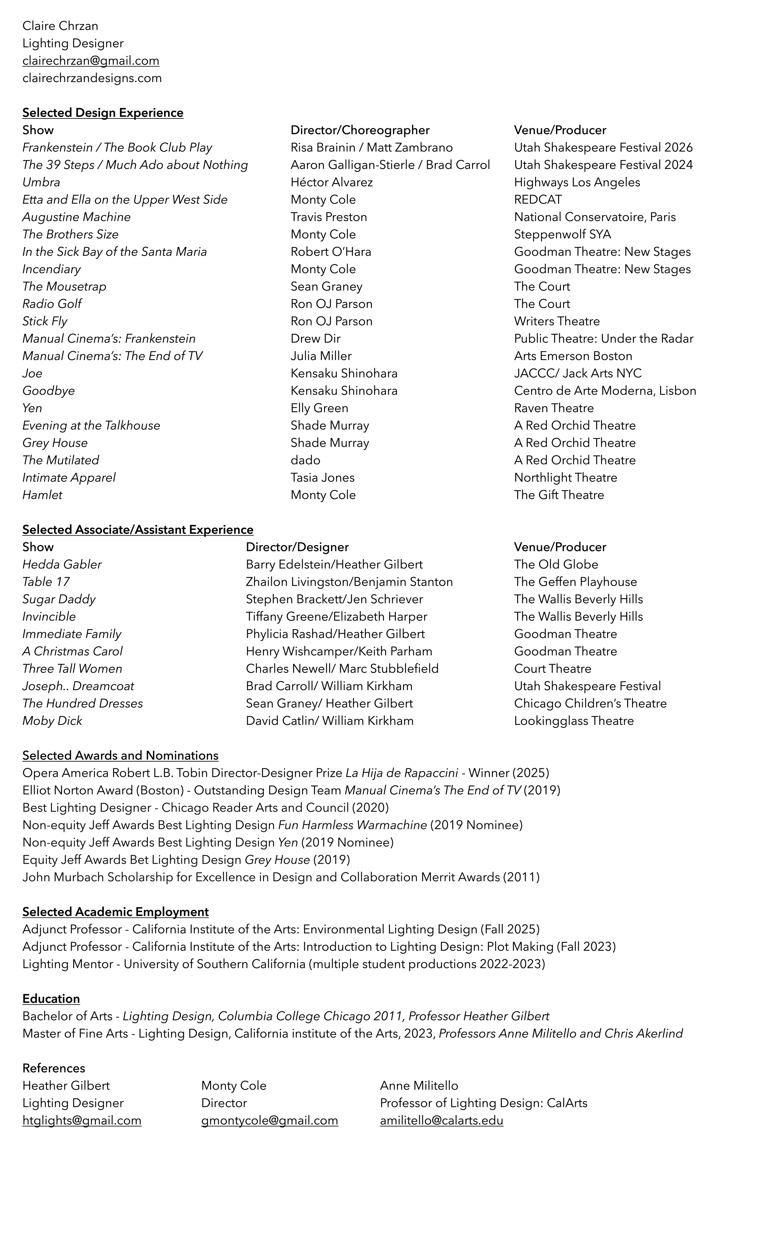 I explore lighting in a multitude of applications. I am a storyteller and I love diving into research and history, whether that be through exploring a text, movement, a community, or building site. My experiences in theatrical lighting design as well as exploration in architectural lighting, light art sculpture, collage, and dance film all contribute to my unique aesthetic and approach to design.